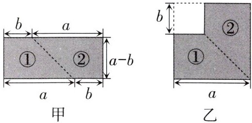 3. 如图甲,把一张长方形纸片沿虚线分割成①和②两部分,将①和②两部分拼起来,得到一个边长为$a$的正方形(如图乙)。