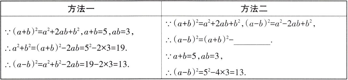 | $\because (a+b)^{2}= a^{2}+2ab+b^{2}$,$a+b= 5$,$ab= 3$,$\therefore a^{2}+b^{2}= (a+b)^{2}-2ab= 5^{2}-2×3= 19$.$\therefore (a-b)^{2}= a^{2}+b^{2}-2ab= 19-2×3= 13$. | $\because (a+b)^{2}= a^{2}+2ab+b^{2}$,$(a-b)^{2}= a^{2}-2ab+b^{2}$,$\therefore (a-b)^{2}= (a+b)^{2}-$______.$\because a+b= 5$,$ab= 3$,$\therefore (a-b)^{2}= 5^{2}-4×3= 13$. |