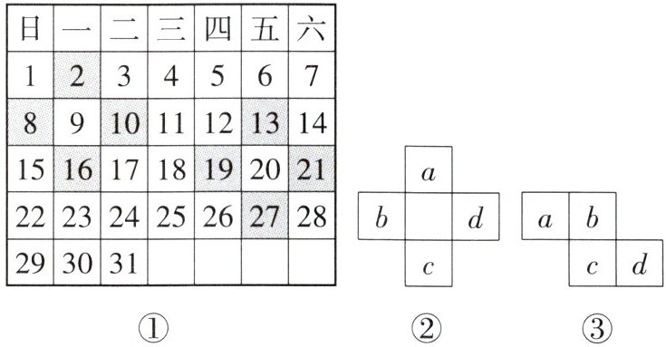 1. 如图①是某月的月历,小刚用如图②所示的方框在图中框出4个数,将框中相对的两数相乘,再相减,计算其得到的结果.例如:$8×10-2×16= 48$;$19×21-13×27= 48$.
