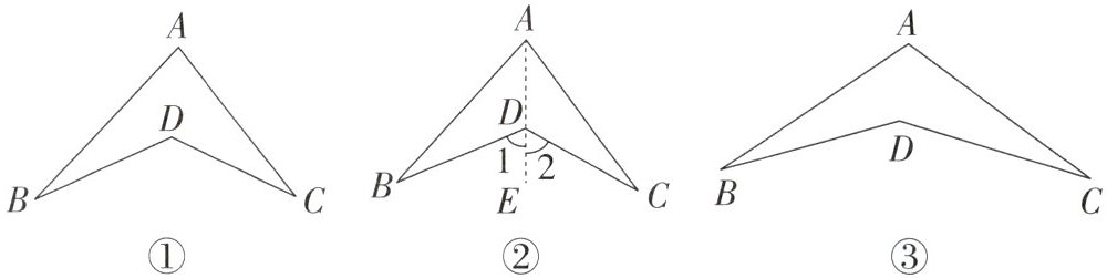 证明:如图②,连接 AD 并延长到点 E. ∵∠1= ∠B+∠BAD(依据),∠2= ∠C+∠CAD,∴∠BDC= ∠1+∠2= ∠B+∠BAD+∠CAD+∠C,即∠BDC= ∠A+∠B+∠C.