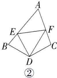 (2)如图②,在四边形ABDC中,∠B+∠ACD= 180°,BD= CD,∠BDC= 120°,以点D为顶点作一个60°的角,角的两边分别交AB,AC于E,F两点,连接EF,探究线段BE,CF,EF之间的数量关系,并加以证明。