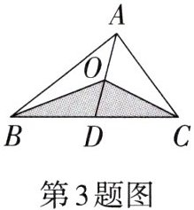 3. 某校有一块面积为40㎡的三角形空地ABC,按图所示的方式进行分割,其中点D,O分别是BC,AD的中点.现计划在△BOC内种植花卉,其余地方铺草坪,则种植花卉(阴影部分)的面积是______㎡.