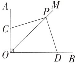 3.如图,$\angle AOB= 90^{\circ}$,$OM平分\angle AOB$,一直角的顶点$P在射线OM$上移动,两直角边分别与$OA$,$OB相交于点C$,$D$,则$PC与PD$相等吗?请说明理由.