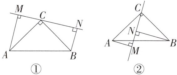 4. 如图①,在$\triangle ABC$中,$\angle ACB= 90^\circ$,$AC= BC$,过点$C在\triangle ABC外作直线MN$,过点$A作AM \perp MN于点M$,过点$B作BN \perp MN于点N$.