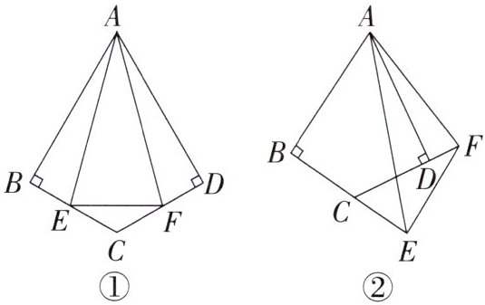 (2)如图②,当点$E$,$F分别在线段BC$,$CD$的延长线上时,其他条件不变,请探究线段$BE$,$EF$,$FD$之间的数量关系。