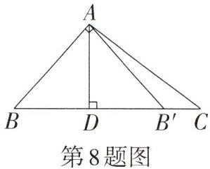 8. 如图,在Rt△ACB中,∠BAC= 90°,AD⊥BC,垂足为点D,△ABD与△AB'D关于直线AD对称,点B的对称点是点B'.若∠B'AC= 14°,则∠B的度数为______.