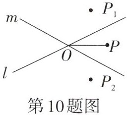 10. 如图,直线l,m相交于点O,P是这两条直线外一点,且OP= 2.8,点P关于直线l,m的对称点分别是点$P_1,P_2,$则$P_1,P_2$之间的距离d的取值范围为______.
