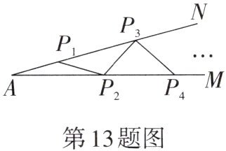 13. 如图,在一钢架NAM中,∠A= 15°,现要在角的内部焊上等长的钢条(相邻钢条首尾相接)加固钢架. 若$AP_1= P_1P_2= P_2P_3=… ,$则这样的钢条最多能焊( )