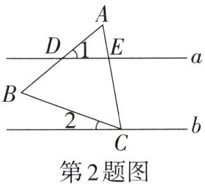 2. 如图,直线a//b,等边三角形ABC的顶点C在直线b上.若∠1= 40°,则∠2的度数为______.