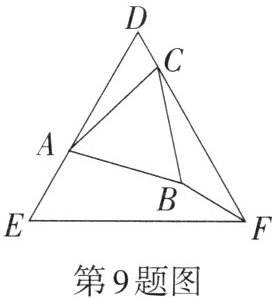9. 如图,在等边三角形DEF中,点A,C分别在边DE,DF上,连接AC,以AC为边在△DEF内作等边三角形ABC,连接BF.若AE= 4,∠CFB= 30°,则CD的长为______.
