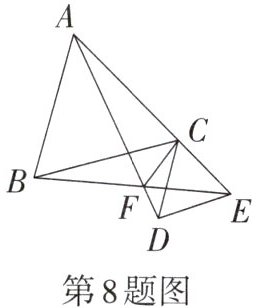 8. 如图,在等边三角形ABC和等边三角形CDE中,A,C,E三点共线,且AC= 3CE,连接AD,BE相交于点F.给出下列结论:①∠AFB= 60°;②连接FC,则FC平分∠AFE;③AF= 3EF;④BF= AF-CF.其中正确的有______个.