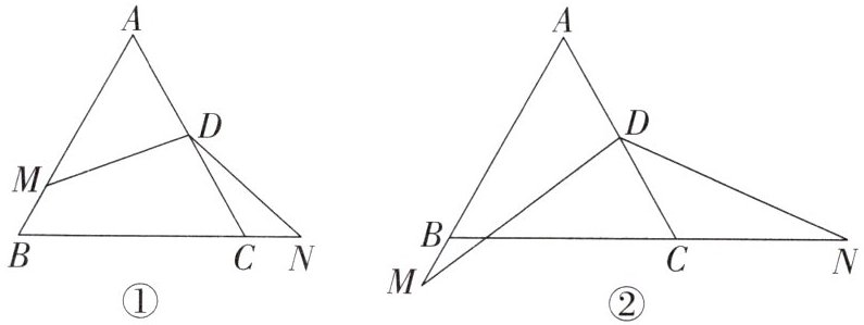 11. 在等边三角形ABC中,点D为AC的中点,点N在BC的延长线上,且∠MDN= 120°.