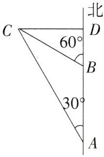 9. 如图,一艘船以15海里/时的速度向正北方向航行,上午8时,从A处测得灯塔C在北偏西30°的方向上,9时30分船到达B处,测得灯塔C在北偏西60°的方向上. 若船继续向正北方向航行,求该船何时到达灯塔C的正东方向的D处.