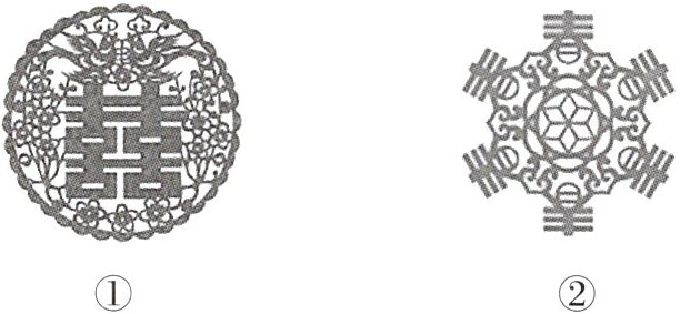 将圆形纸片沿一条直径对折,在纸上设计出轴对称的美术字(如“囍”字的一半),再在周围设计一些对称的装饰图案(如花朵、叶子等),沿着设计好的图案边缘剪下,展开后就得到包含轴对称美术字的窗花。
