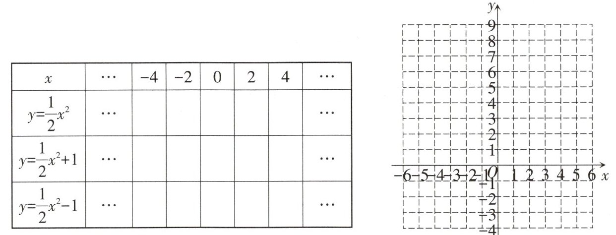 | ... |(2)说明二次函数$y= \dfrac{1}{2}x^{2}+1和y= \dfrac{1}{2}x^{2}-1的图象可以由二次函数y= \dfrac{1}{2}x^{2}$的图象经过怎样的变换得到.