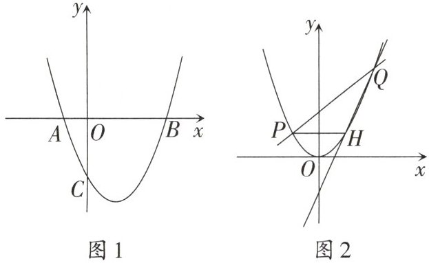 (2)如图2,将上述抛物线平移,使其顶点E与原点O重合得到新的抛物线,直线$y= kx+2(k>0)$与新的抛物线相交于点P,Q(点P在点Q的左侧),过点P作x轴的平行线交抛物线于点H.请说明当k发生改变时,直线QH过定点,并求出该定点的坐标.