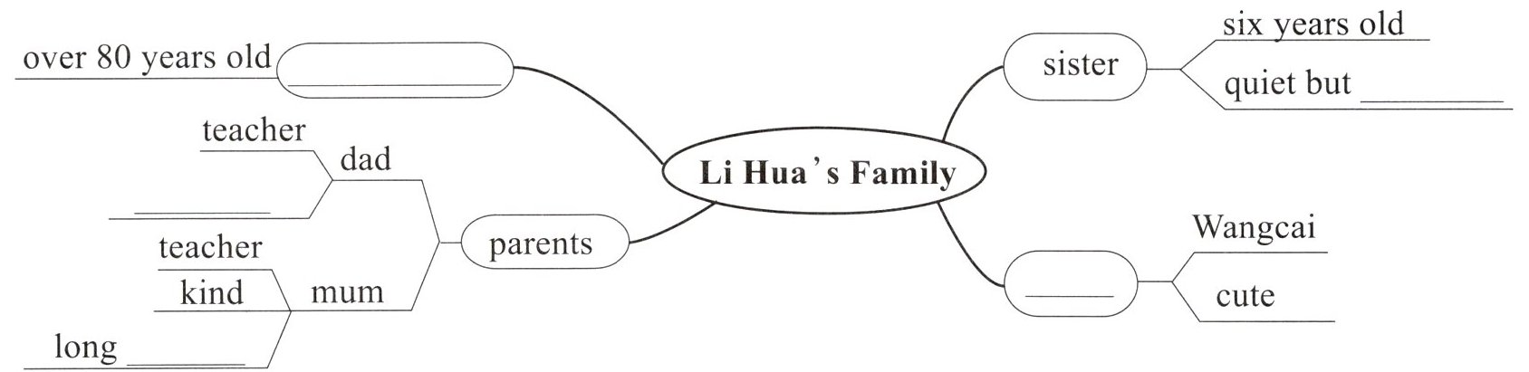 二、1. Six./6. 2. Over 80 years old. 3. She's a bit quiet but very clever. 4. A dog./Wangcai. 5. Taking a walk with Wangcai after dinner./He likes taking a walk with Wangcai after dinner. 三、grandparents; clever; handsome; hair; dog 四、1. Here are some photos of my room. 2. These are my cousin's keys. 3. My new classmate is friendly and she has big eyes. 4. My friend Mike likes going hiking on weekends.