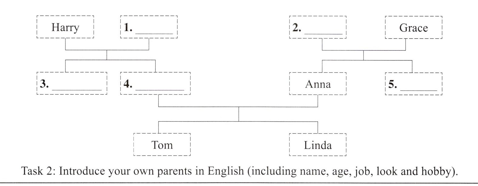 Task 2: Introduce your own parents in English (including name, age, job, look and hobby).______