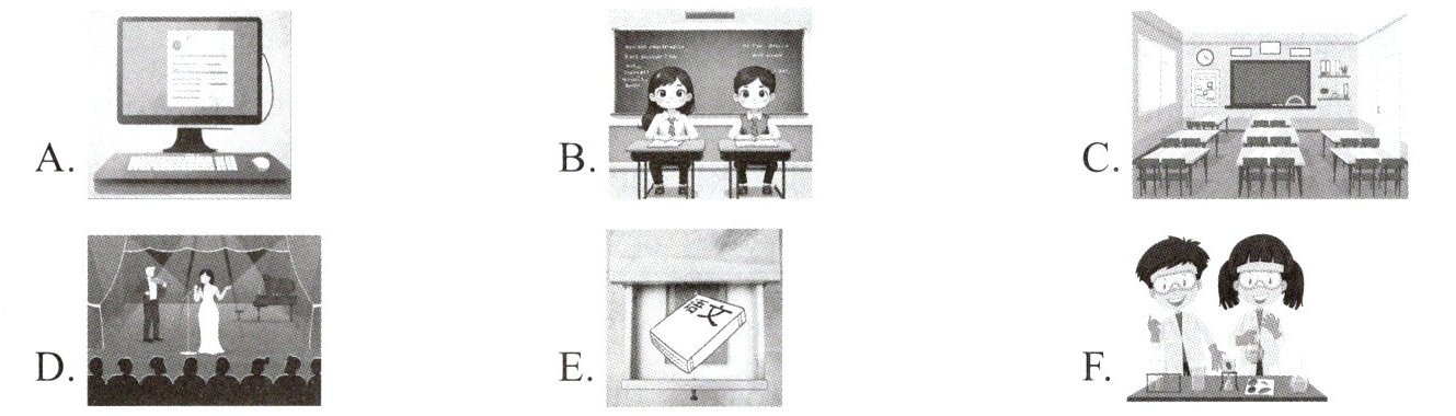 下面你将听到5段短对话。根据你所听到的内容,从所给的A、B、C、D、E、F六个选项中,选出与你所听内容相符的图片。每段对话听一遍。