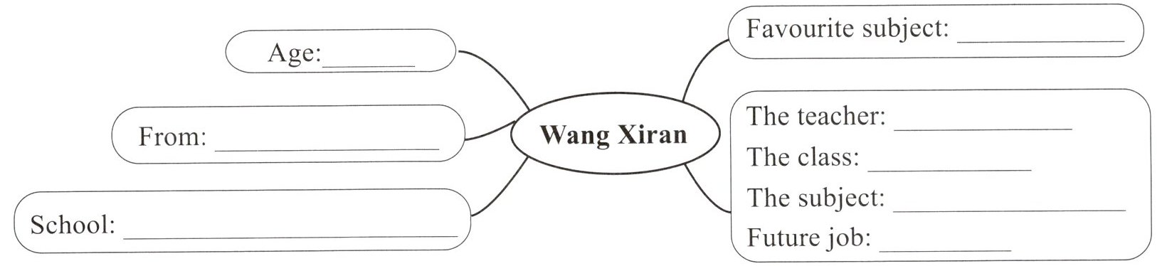 二、1. Taiyuan 2. Three 3. Because the geography teacher Mr Wang is very kind and his classes are amazing 4. He can learn about many famous lakes and mountains and know delicious food in different places 5. Difficult but useful 三、Age: 11; From: Datong, Shanxi; School: No.5 Middle School; Favourite subject: geography; The teacher: Mr Wang; The class: amazing; The subject: difficult but useful; Future job: a guide 四、1. I have two Chinese classes and one P.E. class today. 2. My favourite subject is Math because it's very interesting. 3. My music teacher is Ms Zhao, and she is very friendly to all of us. 4. I can learn many new words from English class. 5. Biology is boring but important.