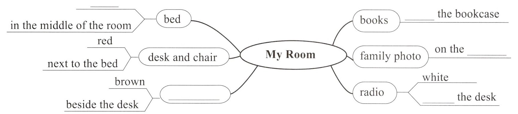 My name is Cindy. This is my room. Many things are in my room and they're in different colours. In the middle of the room is a yellow bed. Next to the bed is a set of desk and chair. They are red. There's a brown bookcase beside the desk. Some English books, Chinese books, computer books and picture books are in it. A photo of my family is on the wall. I don't have a TV or a computer, but I have a radio. It's white. I like listening to English on it every day. Where is it? You can see it on the desk.