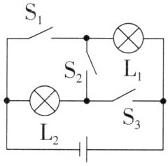 A.闭合开关$S_{1}$、$S_{2}$、$S_{3}$,灯$L_{1}$、$L_{2}$并联