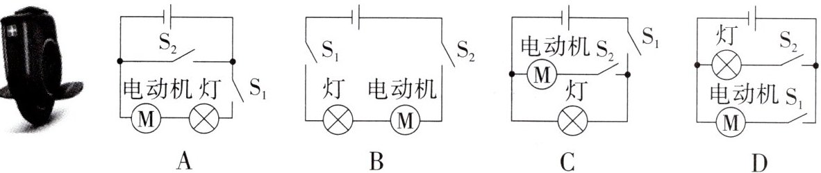 C 解析 由题意可知,指示灯和电动机工作时互不影响,所以指示灯和电动机并联;人站在平衡车踏板上时,开关S₂自动闭合,电动机才能启动,说明开关S₂控制电动机;当开关S₁闭合时,指示灯亮但电动机不启动,当遇紧急情况时,开关S₁自动断开,电动机停止工作,说明开关S₁在干路中,故选C。