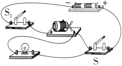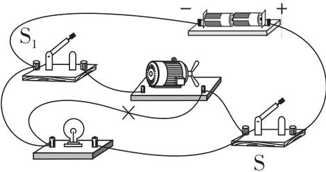 12. 如图所示的电路中,有一根导线连接错误,请将错误导线用“×”标出,并画出正确的连接方式。要求:改正后,小灯泡和电动机并联,开关$S$控制所有用电器,开关$S_{1}$只控制电动机。