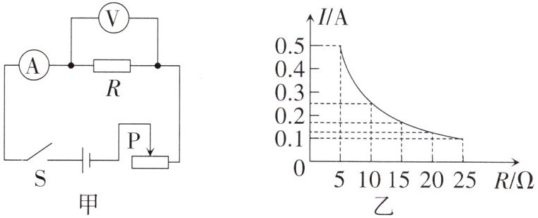 3. 小明利用如图甲所示的电路探究电流与电阻的关系。已知电源电压恒为6V,实验用到的定值电阻的电阻分别为5Ω、10Ω、15Ω、20Ω、25Ω。实验中多次改变接入电路中的电阻,记下电流表的示数,得到如图乙所示的电流$I随电阻R$变化的图像。