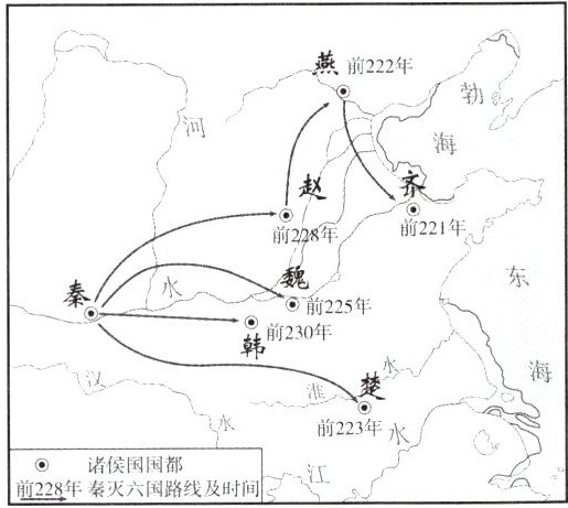 2. 如下是秦灭六国形势图,观察图片,指出秦灭六国的顺序 ( )