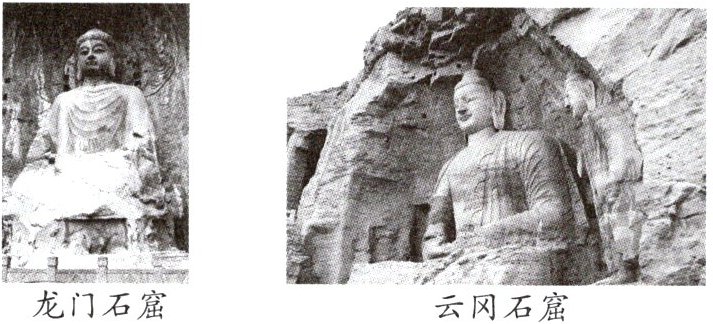 材料三 魏晋南北朝时期,社会动荡不安。为了摆脱现实苦难,人们纷纷信仰佛教。统治阶级为宣扬佛教,在一些山崖上开凿了许多石窟。下面两幅图就是当时最著名的石窟艺术成就。