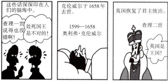 1. 分析漫画内容:第一幅图反映处死查理一世后有人认为“处死国王是不对的”;第二幅图显示克伦威尔去世(1658年);第三幅图呈现英国恢复君主统治,查理二世宣称“英国是王国!”。