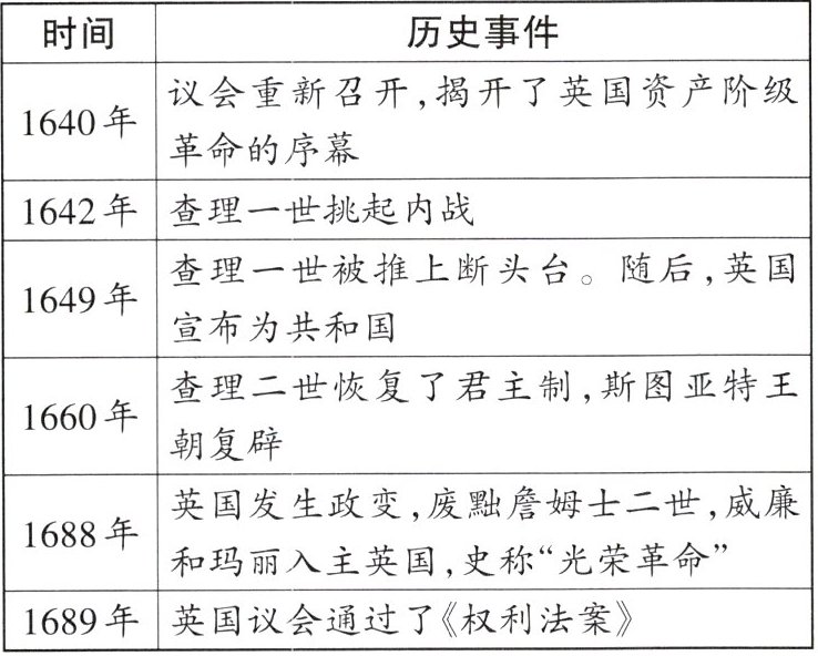 2. 结合英国资产阶级革命过程:革命期间经历了处死查理一世、共和国时期、克伦威尔独裁、斯图亚特王朝复辟等阶段。