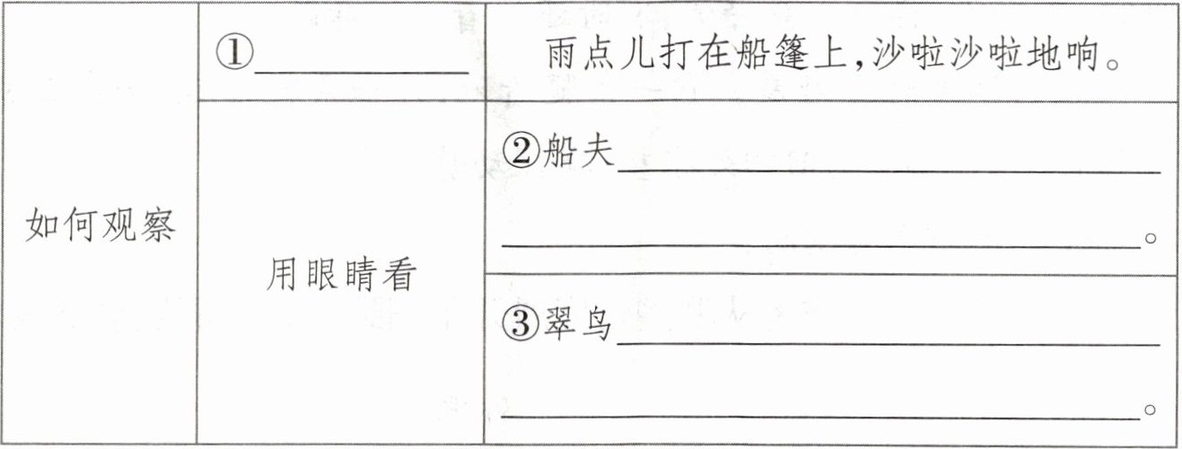 )了下去。1.读语段,体会作者观察的细致,完成表格。