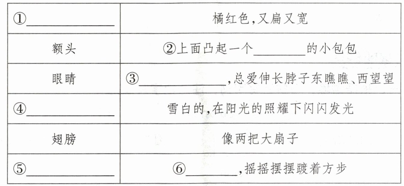 ①嘴巴 ②淡黄色 ③亮晶晶的 ④羽毛(或“衣裳”) ⑤脚掌 ⑥扁扁的