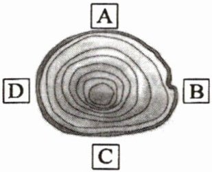 看资料,我们知道这棵位于北半球的树桩的______(填字母)处的一面是北方。