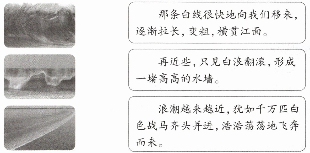 那条白线很快地向我们移来,逐渐拉长,变粗,横贯江面。再近些,只见白浪翻滚,形成一堵高高的水墙。浪潮越来越近,犹如千万匹白色战马齐头并进,浩浩荡荡地飞奔而来;那声音如同山崩地裂,好像大地都被震得颤动起来。
