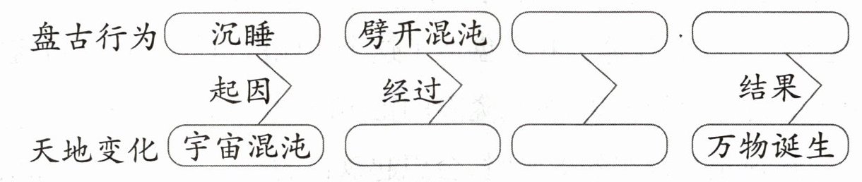 熟读课文,补充下图,了解盘古开天地的起因、经过和结果。