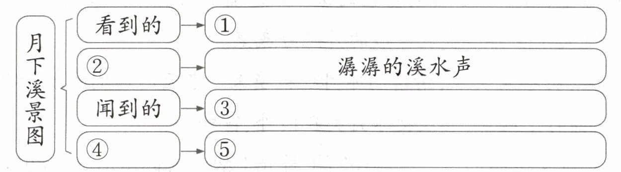 2. 作者通过观察和想象,描绘出月光下的家乡。通过 ,你会感受到夏夜月光下人们的惬意;秋天,月光铺下来,铺到 、 ,你的脑海仿佛浮现出 的画面。