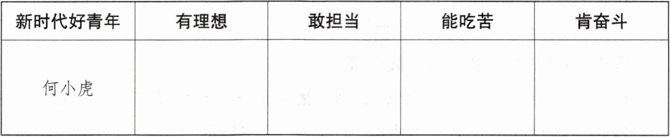 4. 习近平总书记勉励广大青年“立志做有理想、敢担当、能吃苦、肯奋斗的新时代好青年”。你认为何小虎是新时代好青年吗?填一填。
