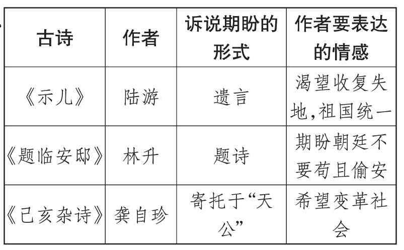 四、诗人的拳拳爱国心,浓缩在他们的“期盼”中。读古诗,完成下面的表格。