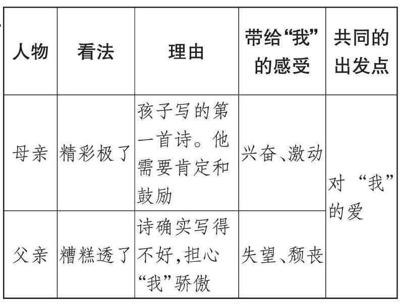 五、根据课文内容,补充填写表格,了解父母对同一首诗有不同看法的原因。