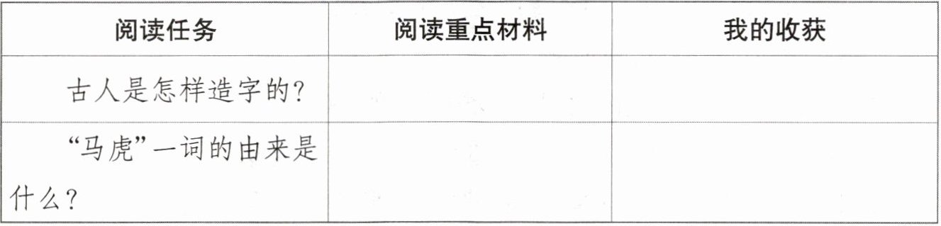 1.材料一:通过汉字,我们可以看出祖先造字时是怎样想的。 材料二:“马虎”一词的由来。 2. 阅读任务 阅读重点材料 我的收获 古人是怎样造字的? 材料一 我知道了“监”和“女”字是怎样造出来的,分别表示什么意思。 “马虎”一词的由来是什么? 材料二 我知道了“马虎”一词的由来。 3.略。