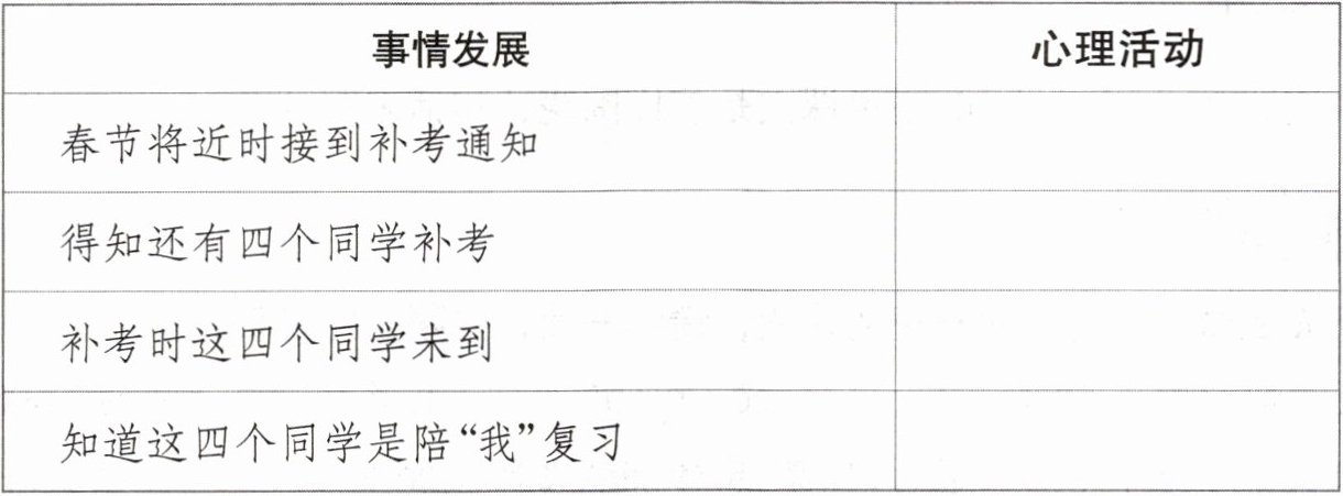 2.随着事件的发展,“我”的心理发生了哪些变化?将下面的表格补充完整。