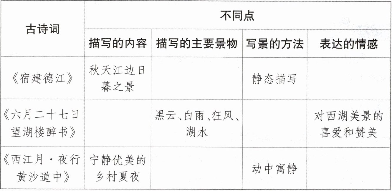 四、阅读课文中的三首古诗词,把下面的表格补充完整。
