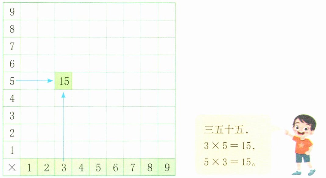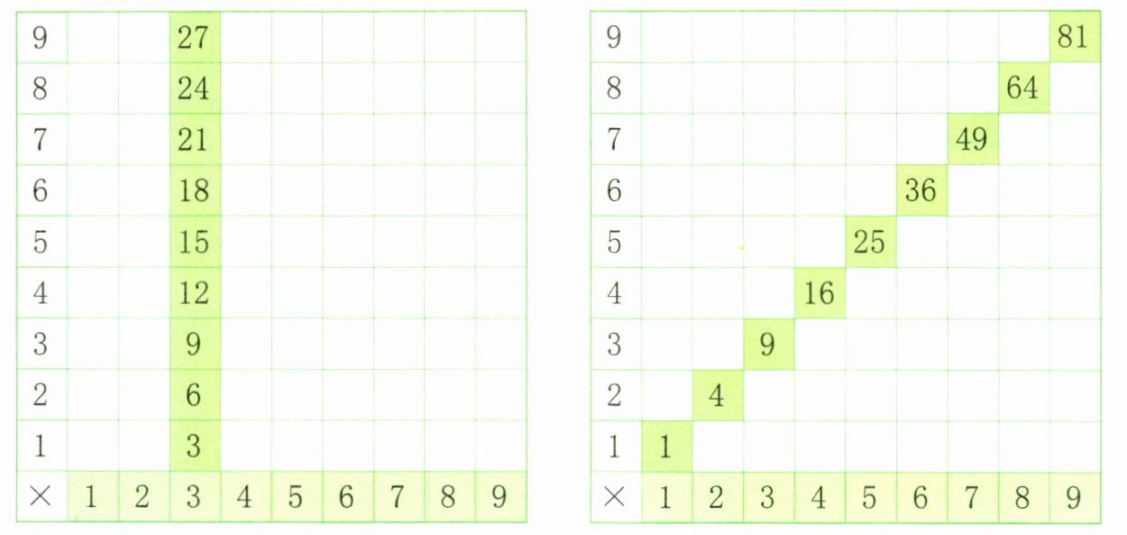 4. 乘法表中,横着看、竖着看都能找到乘法口诀的规律,斜着看是相同乘数相乘的积,通过乘法表能更好地理解乘法口诀之间的关系,方便记忆和运用乘法口诀计算乘除法。