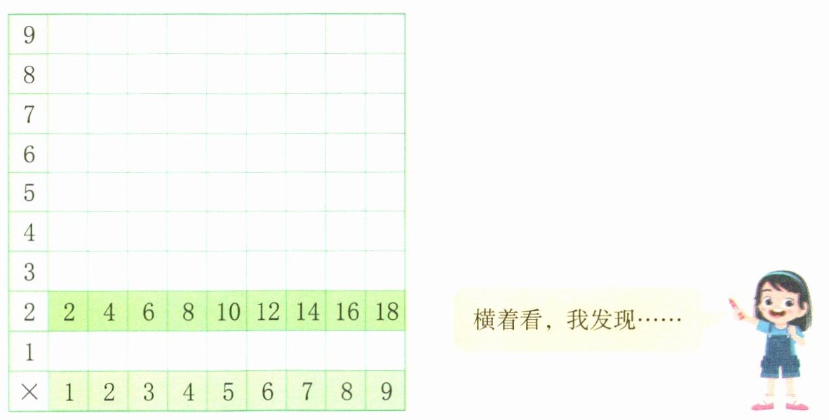 2. 横着看,每一行的积依次是该行最左边的数乘1、2、3、4、5、6、7、8、9的结果。