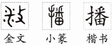 1. 书写“播”字时,左边“扌”的“㇀”要向左探出头,使字有稳定感;右边“釆”的撇和捺要写得舒展,盖住下面的“田”字。请在方格里练写两个: