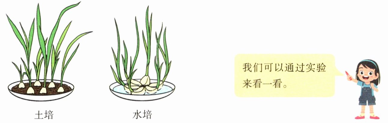 每组同学在一个盘子里放入一些土,种下蒜瓣;在另一个盘子里放一些水,放入蒜瓣。将两个盘子放到能被阳光照射到的同一地方。