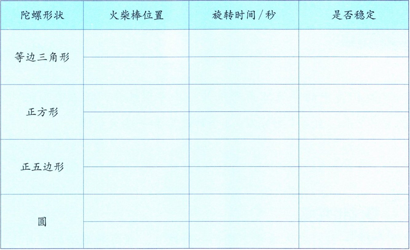 在小组里依次旋转各人制作的陀螺,观察并记录陀螺的旋转时间,看看旋转是否稳定。
